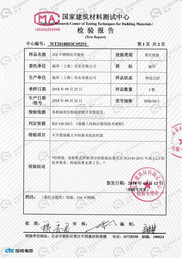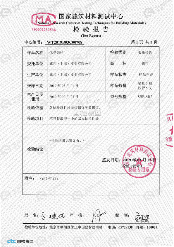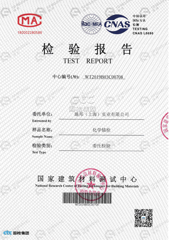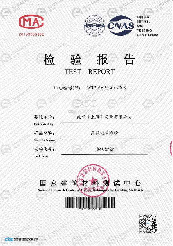 表格未列出的產品,請參照《JGJ145-2013混凝土結構后錨固技術規程》按照承載力極限狀態計算方式得出相應數據,具體方案請咨詢施邦 (上海) 實業有限公司技術部