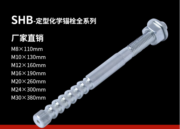 SHB-特殊倒錐形化學錨栓栓由螺桿、平墊、螺母組成,通過化學粘接劑保證錨栓與混凝土體的粘接強度,又通過倒錐體與混凝土機械鎖鍵保證連接強度。需配合施邦改性環氧注射式植筋膠使用。