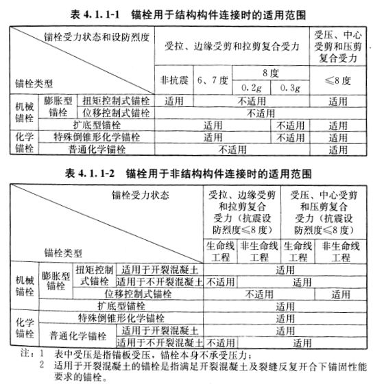 JCJ 145-2013《混凝土結構后錨固技術規程》8.1.1后錨固技術適用于設防烈度8度及8度以下地區,以鋼筋混凝土、預應力混凝土為基材的后錨固連接,在承載結構中采用后錨固技術時宜采用植筋;設防烈度不高于8度(0.2g)的建筑物,可采用后擴底錨栓和特殊倒錐形化學錨栓。JCJ 145-2013《混凝土結構后錨固技術規程》4.1.1 錨栓應按照錨栓性能、基材性狀、錨固連接的受力性質、被連接結構類型、抗震設防等要求選用。錨栓用于結構構件連接時的適用范圍應符合表4.1.1-1的規定,用于非結構構件連接時的適用范圍應符合表4.1.1-2的規定。
