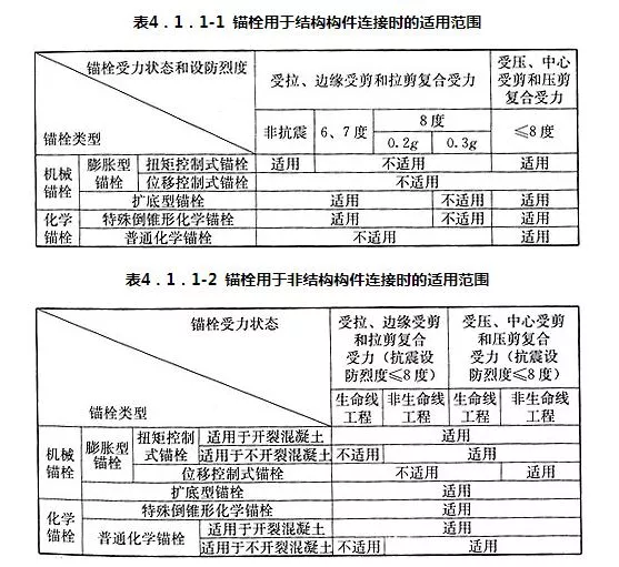 化學植筋的適用于鋼筋混凝土承重結構和砌體承重結構構件的錨固,錨栓主要應用于普通混凝土承重結構和非結構構件的后錨固連接,承重結構中不可使用膨脹錨栓來固定,必須使用擴底錨栓或者倒錐型錨栓。化學植筋可以作為新增鋼構件的錨固件,但是大量應用的是新增混凝土構件或擴大截面混凝土構件的鋼筋生根等;錨栓只能作為被連接鋼構件的連接件等。錨栓用于結構構件連接時的適用范圍如下: