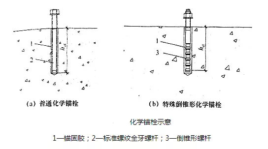 按照受力機理可分為兩種:普通化學錨栓和特殊倒錐形化學錨栓。特殊倒錐形化學錨栓,在安裝時通過錨固膠與倒錐形螺桿之間滑移可形成類似于機械錨栓的膨脹力。