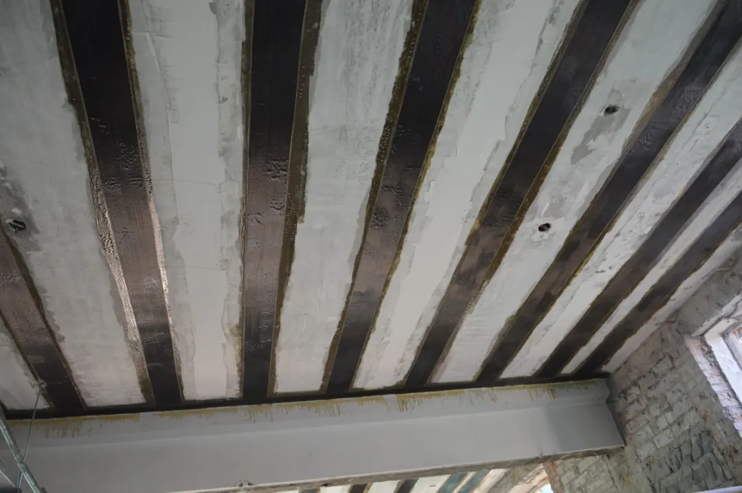 受彎構件正截面加固常見于梁、板構件,當梁、板構件使用荷載增加導致受彎承載能力不足時,可對其進行加固。可在受彎構件的受拉邊混凝土表面上粘貼纖維布進行加固,以此提高受拉區的抗拉強度,從而提高結構構件的承載能力。