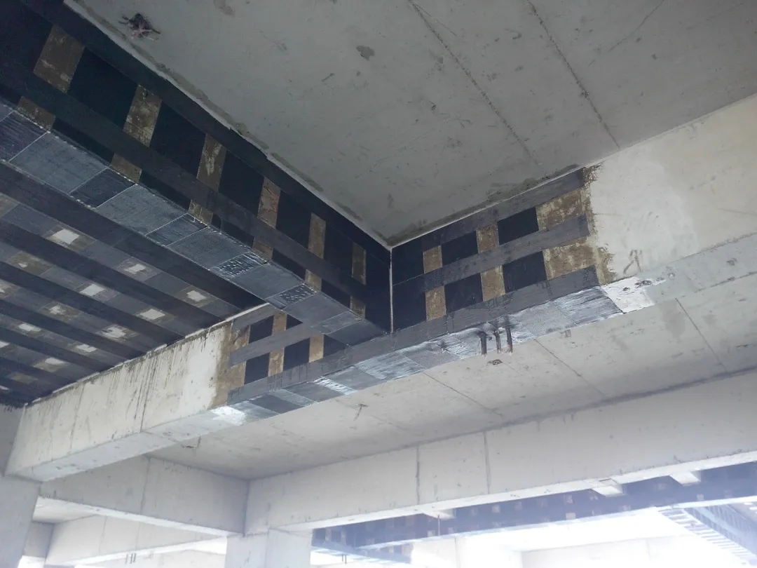 當混凝土構件出現裂縫且需要對裂縫進行修復時,可先使用灌縫膠對裂縫進行修復后,再進行碳纖維布粘貼。粘合碳纖維布可以限制裂縫的發展,間接提高結構的抗裂性。